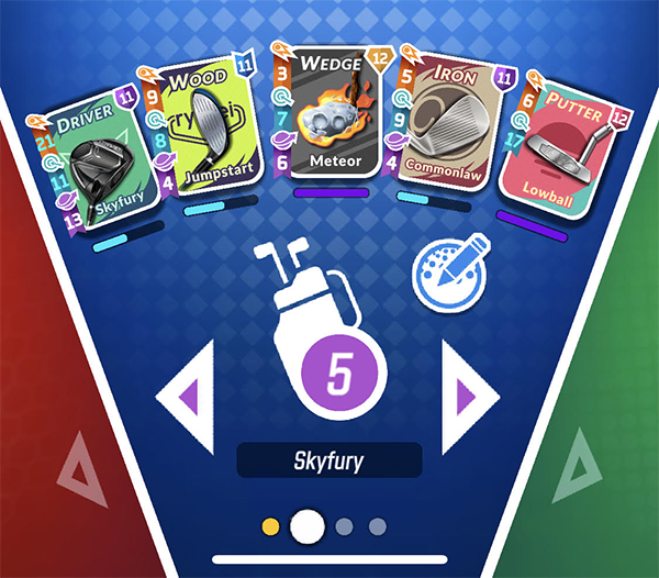 Skyfury is one of the first really game-changing clubs that you unlock. This setup is sort of a basic boost configuration with Meteor double-boosting Jumpstart to give Skyfury a +4 power. Commonlaw gives a natural +2 to the bag’s accuracy. After you’ve unlocked Meteor’s Alien Relic Right boost, Commonlaw’s +2 accuracy doubles to +4. Commonlaw also gives +2 to your putter here, which could be any that you choose. Lowball is a pretty good early-ish game option, though later on you might want to go with Sparky, Homecoming or one of the others. If you have not unlocked Meteor yet (Skyfury’s power will be cut by -4) you could put Conspiracy in the 3 slot to give you a 25% wind reduction. Even though it’s unlocked early on in the game, Skyfury is the only club that can adquately reach a select few holes even at level 9. You’ll want a variation of this setup as one of your six bags.